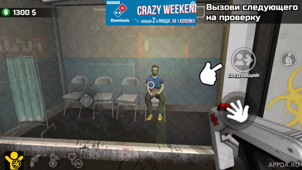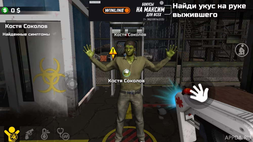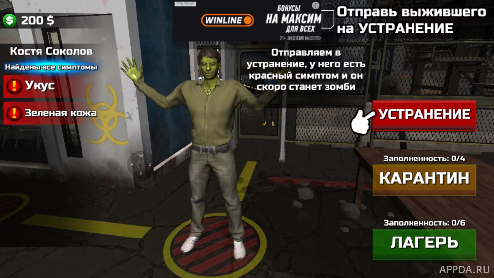 Приступайте к своей работе и примите первых выживших. Используйте профессиональный сканер, с помощью которого будете искать разнообразные факторы заражения. После найденных симптомов необходимо принять решение, отправить человека в карантин, в лагерь, или же устранить на месте?! Если видны явные симптомы, уничтожаете. Если есть какие-то дефекты, в которых не уверены - отправляете в карантин, если человек полностью чист - отправляйте в лагерь.