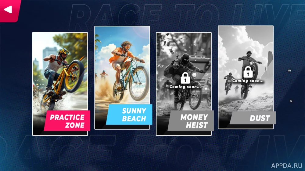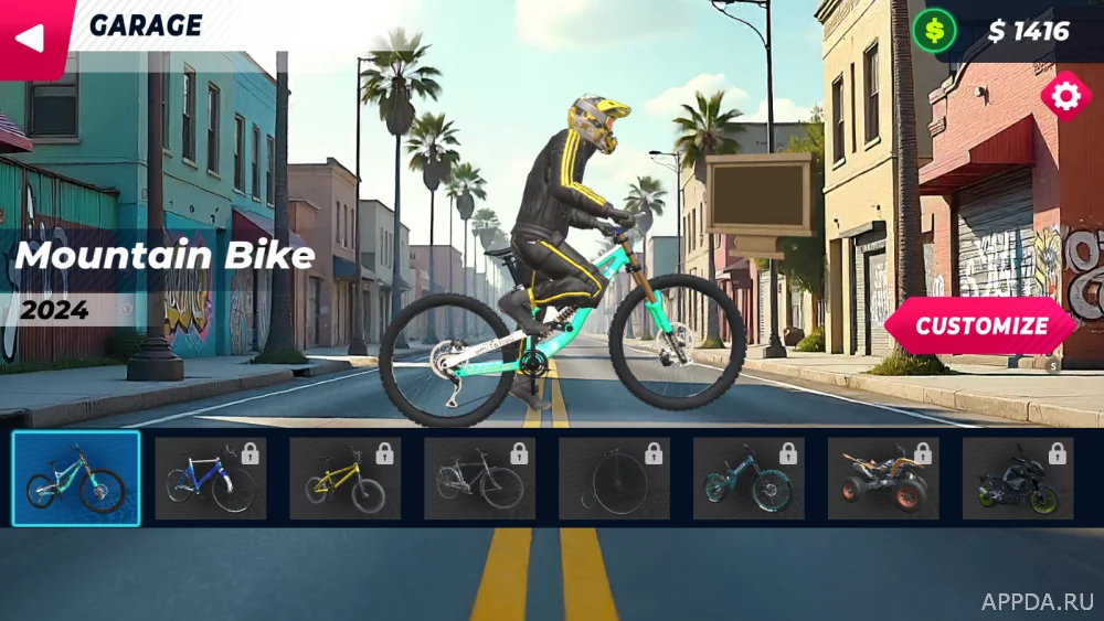 Изучите базовые азы езды, чтобы уверенно держаться на дороге. Постепенно начинайте добавлять классические трюки. К примеру, это может быть езда на переднем или заднем колесе. По мере прохождения игры сможете получать все больше потрясающих элементов, которыми будете удивлять зрителей. Проходите уровни, и зарабатывайте деньги на другие велосипеды (8 штук). Каждый велик можно полностью кастомизировать под себя. Также не забудьте про классную униформу героя!