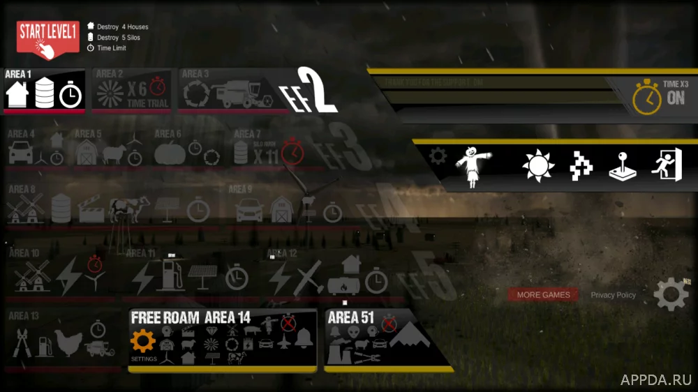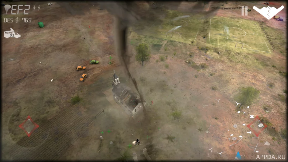 По мере прохождения игры сможете увеличивать мощь и скорость торнадо. Путешествуйте по самым разным городам и "сравняйте" их с землей. Бесплатные покупки позволят избавиться от рекламы, а также сможете разблокировать платные зоны.