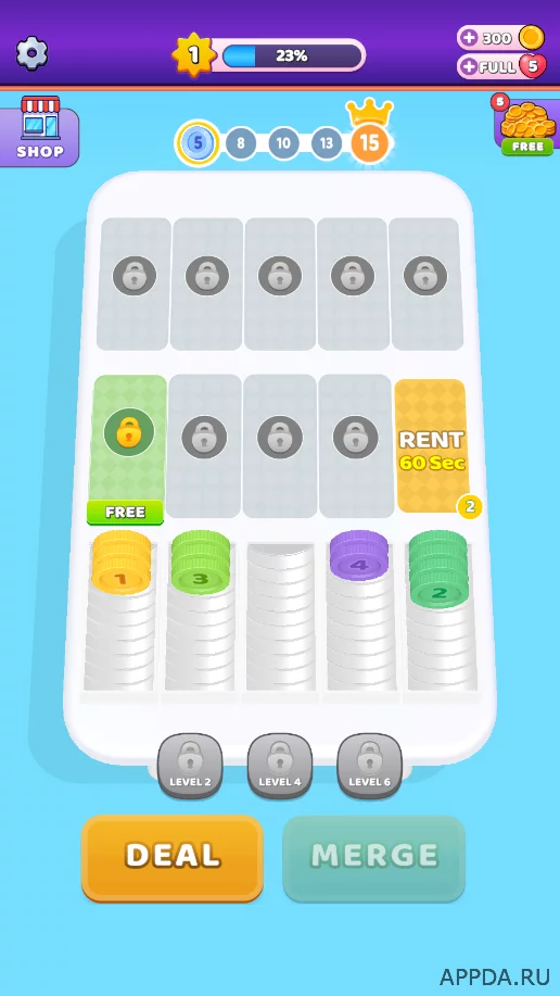 Новая игра головоломка с монетами предлагает испытать себя в совершенно новых условиях. Задача заключается в том, чтобы сортировать монеты по кассовым ячейкам. Монеты имеют разные цвета. Сделайте так, чтобы все они оказались в одном ряду одинакового цвета. Изначально будет доступно только 5 ячеек, но с прохождением уровней сможете приобретать дополнительные ячейки (всего 15 штук). Как только ряд монет будет собран, необходимо поглотить его для очищения ячейки.