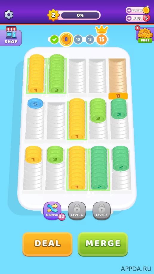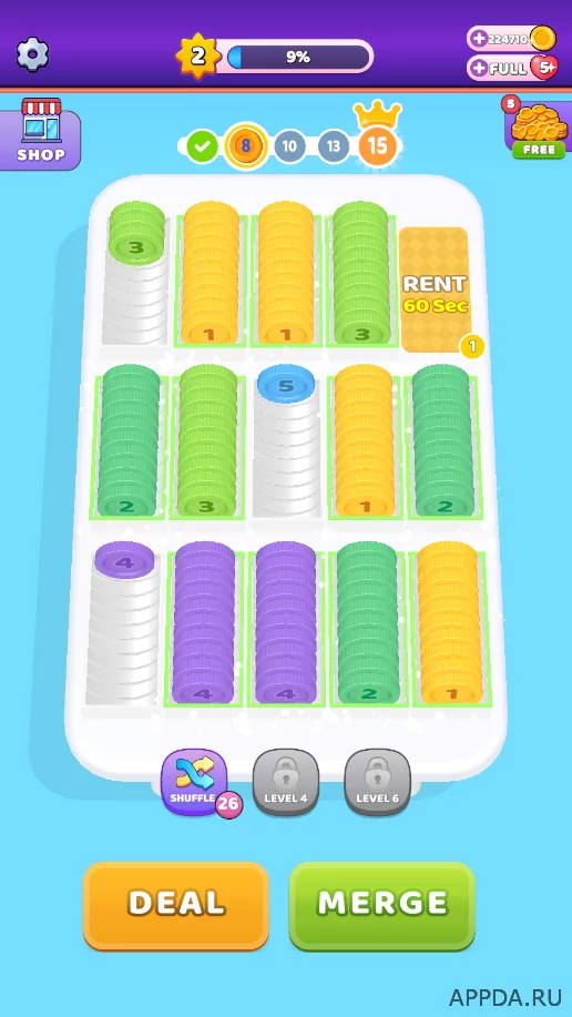 Добавляйте на поле все больше монет для сортировки. Добавляться они будут в разном количестве и с разными цветами. Открыв все ячейки сможете устроить себе самый настоящий штурм мозга. Три бустера помогут справиться с затруднениями. Используйте возможность совершать бесплатные покупки, которые подарят игру без рекламы и много монет.