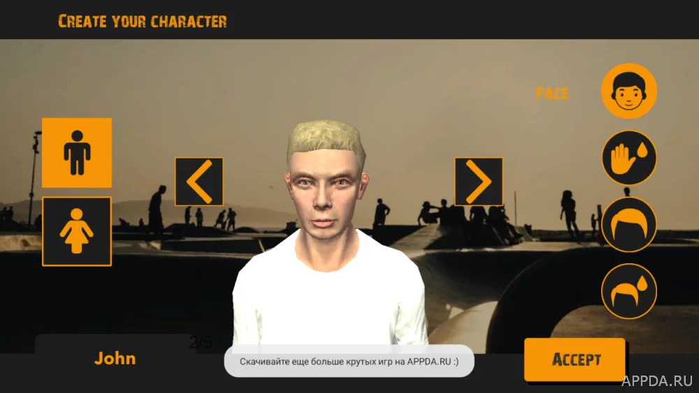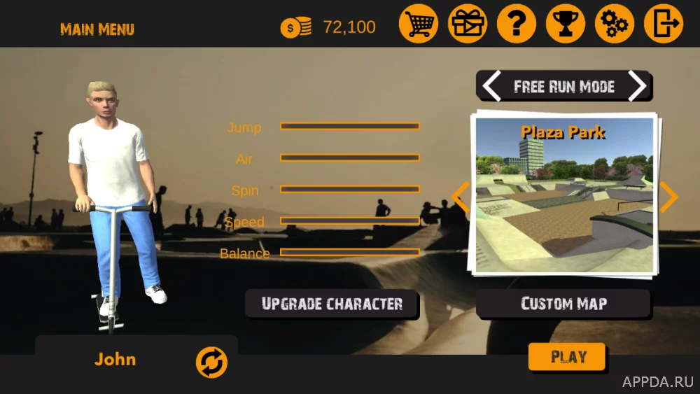 Перед началом безумного приключения создайте своего крутого аватара, выбрав пол, лицо, кожу и прическу. Выполняя трюки будете зарабатывать игровую валюту, за счет которой сможете улучшать скины персонажа: прыжки, трюки в воздухе, скорость и другое. Также можете настраивать внутренние характеристики героя. Впереди ждет множество уникальных трасс, на которых будете творить невероятное! Но для перехода на следующую локацию, необходимо завершить все миссии на предыдущей.
