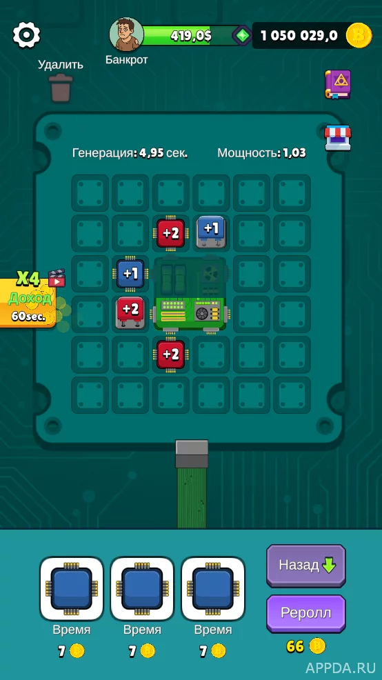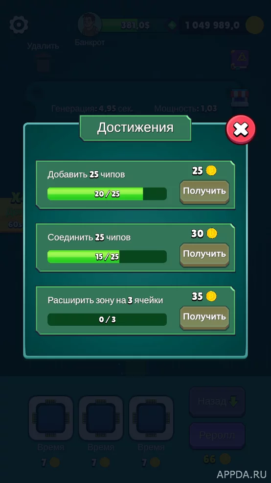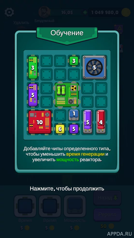 Начните создавать комбинации из чипов и коннекторов, чтобы начать зарабатывать игровые деньги. Соединяйте их между собой, чтобы повышать уровень. Добавляйте чипы определенного типа, чтобы уменьшить время генерации и увеличить мощность самого реактора. Получайте различные достижения, выполняя различные задания. Увеличивайте зону микросхем, чтобы зарабатывать как можно больше денег.