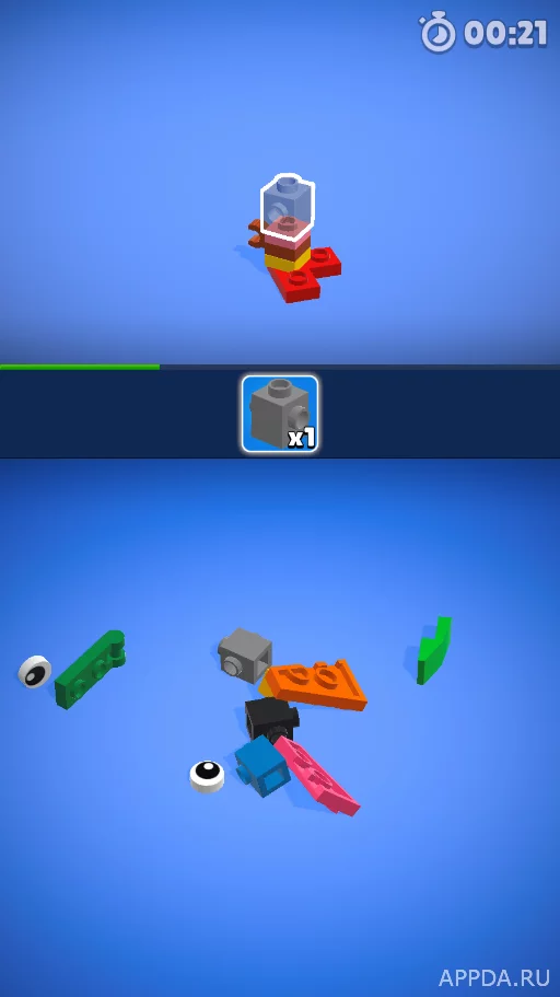 Процесс строительства будет проходить максимально легко и приятно - просто коснитесь нужной детали. Впереди ждет множество интереснейших наборов, которые помогут воссоздать целый мир! В каждом наборе имеется свое определенное количество элементов. Чтобы собирать, ориентируйтесь на базовые подсказки от игры (какой элемент необходимо выбрать). Находите на столе подходящую деталь, тапайте по ней, и та отправится на свое законное место! Собирайте крутых персонажей, здания, монументы и другое. С каждым набором, деталей может становиться больше и больше, что поможет тренировать внимательность.