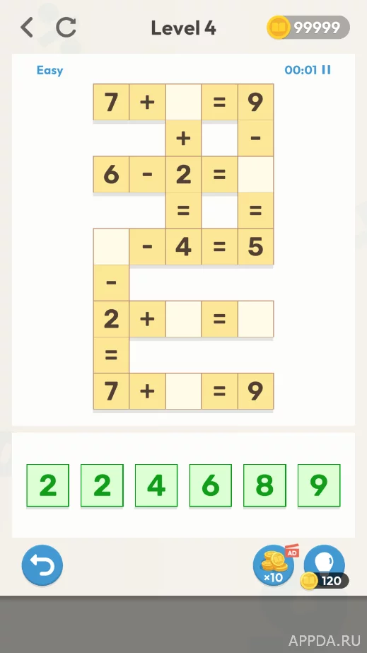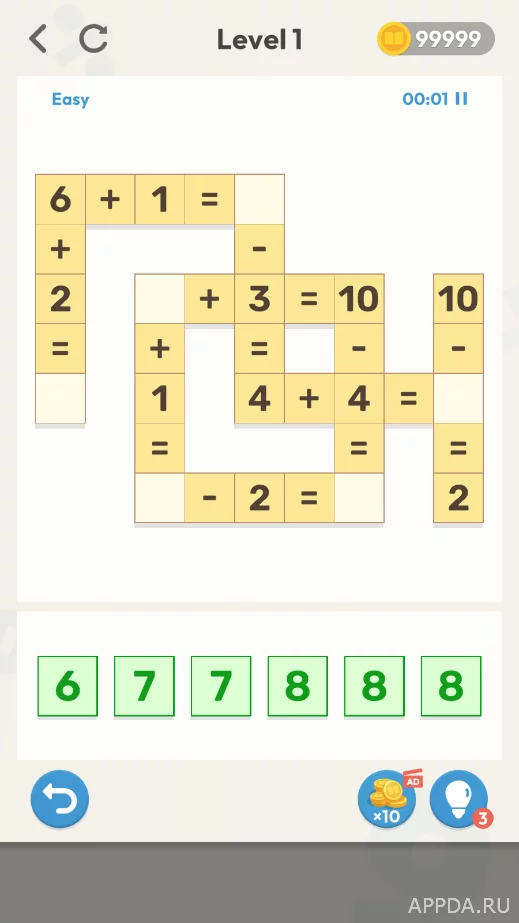 Математическая головоломка будет представлена в виде кроссворда, что добавит еще большей интересности в прохождении. Внизу можете видеть цифры, которые необходимо расставить в свободные клетки таким образом, чтобы со всех сторон получился верный ответ. Проходя уровни будете зарабатывать игровые монеты, за счет которых можно приобретать подсказки. Но благодаря нашему моду сможете получить много денег, а также отключить рекламу, что не будет отвлекать от затягивающего процесса.