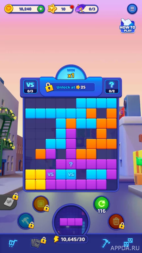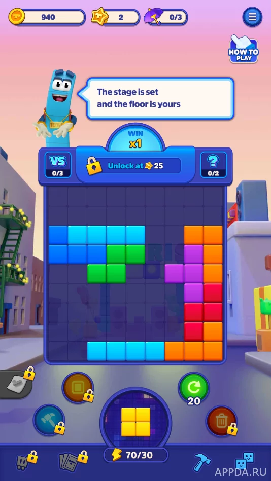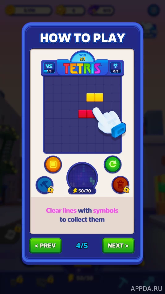 Tetris Block Party - погрузитесь в красочную игру-головоломку в качестве тетриса. Проходите многочисленные уровни и получайте эстетическое удовольствие. Сама игра многим похожа на классический тетрис. Однако, при разрушении очередной линии из блоков, верхние кубики не будут опускаться вниз, а застынут на том же месте, что добавляет некоторую сложность.