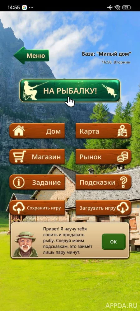 Используйте качественный инвентарь для комфортной рыбалки. Игра предлагает разные базы, где можно рыбачить в свое удовольствие и прокачивать навыки. Чтобы проживать на той или иной базе, необходимо снимать жилье на заработанные деньги. Следуйте подсказкам помощника, чтобы научиться ловить рыбу. Выберите наиболее удачное место для рыбалки, осмотрев территорию. После чего достаньте удочку, кликните по воде и ждите свой первый улов.