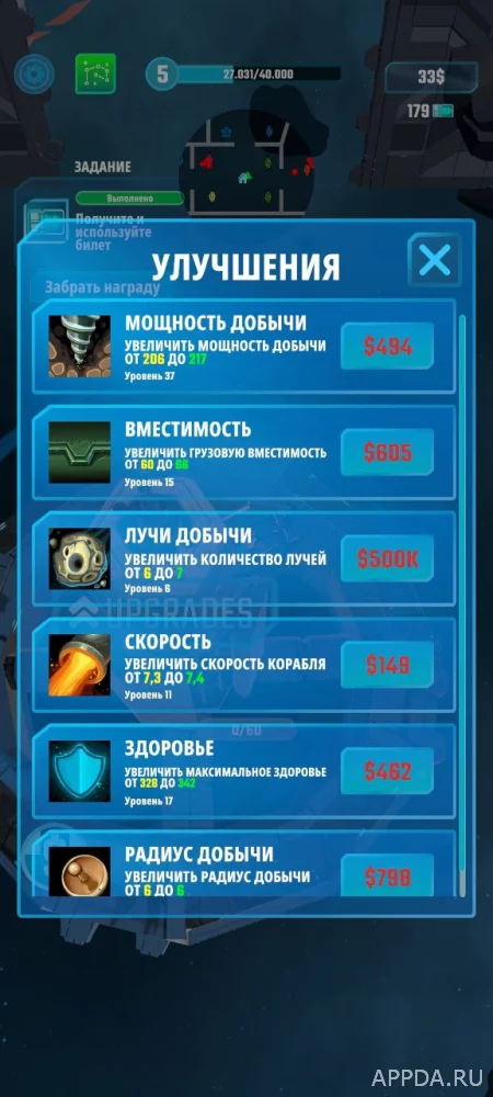 Открывайте порталы, встречайтесь с самыми опасными противниками и заходите как можно дальше. На базе можно производить следующие улучшения: мощность добычи, вместимость, лучи добычи, скорость, здоровье, радиус добычи. Каждая зона имеет свои определенные ценные материалы, которые охраняют самые опасные оппоненты. Также можно расширять и строить базы с заводами в самых различных уголках вселенных.