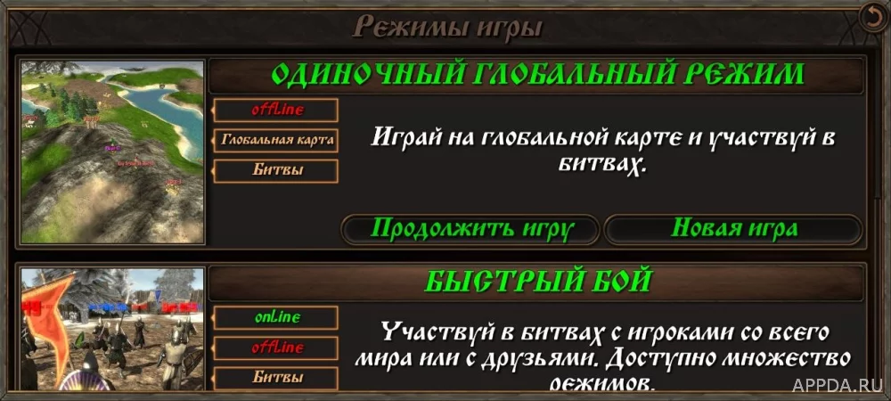 После нажатия кнопки "Играть" открываются следующие режимы:
