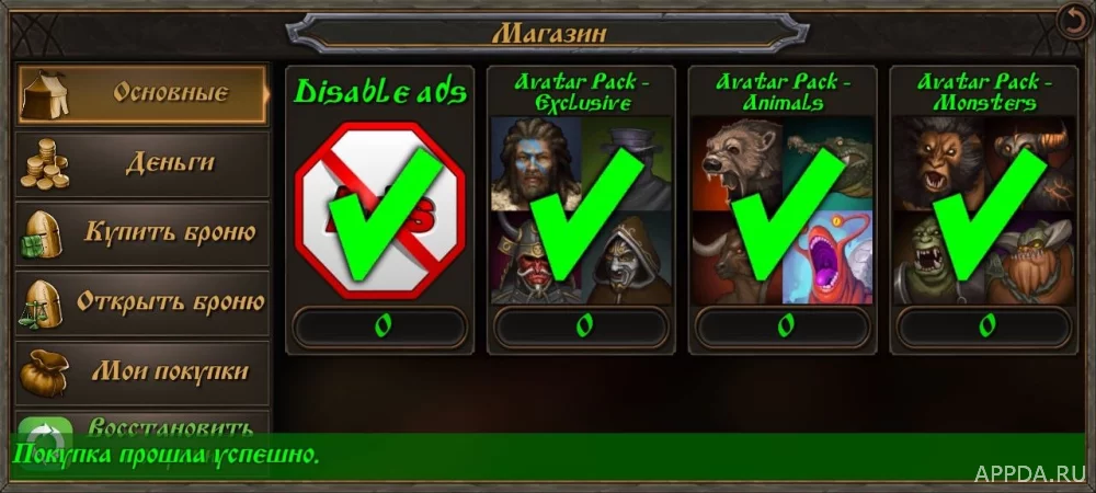 Бесплатные покупки. Можно сделать игру без рекламы, получить много монет, разблокировать премиeм броню и персонажей.