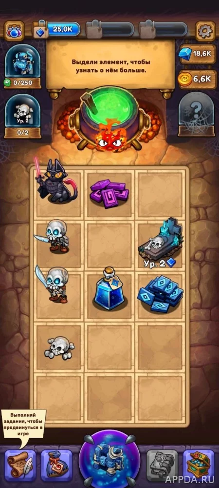 Познакомьтесь с волшебным котом по имени Бастет, который временно присматривает за домом. Он станет проводником в мире тайн и поможет приблизиться к главной цели - раскрыть древнюю загадку и призвать хозяина из самой преисподней. Исследуйте игровое поле, собирайте ресурсы и объединяйте одинаковые элементы, чтобы создавать более мощные предметы. Соединяйте кости, получайте черепа, а затем создавайте полноценные скелеты. Они оживут и будут восстанавливать ману, а также помогут в сражениях с монстрами. Каждое действие ведёт вперёд по сюжетной линии. Магический котёл - ключ к более сложным и интересным преобразованиям.
