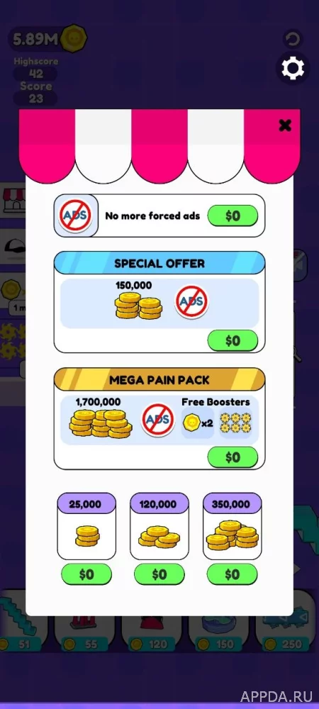 Бесплатные покупки. Можно получить много монет и сделать игру без рекламы.