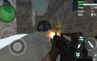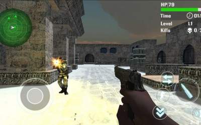 В этом приложении Вы сможете увидеть ту самую популярную игру Counter-Strike 1.6. Стыдно за то, что официальные разработчики контры до сих пор не смогли портировать даже старую легендарную версию 1.6 на Android-устройства, а другие умельцы давно это уже сделали. Данное приложение — это почти чистая копия знаменитой CS. Звуки, оружие и даже карты очень похожи. Вы должны бегать по карте в одиночку и убивать врагов. На специальном радаре будут отображаться враги. Просто находите их и убивайте. Вы сможете купить себе абсолютно любое оружие и желаемое количество патронов для него. Кстати, от пары попаданий врага у Вас будет сниматься всего лишь пару жизней. А у Вас их 100, как и полагается. За каждый труп убитый в голову, Вы будете получать больше очков!